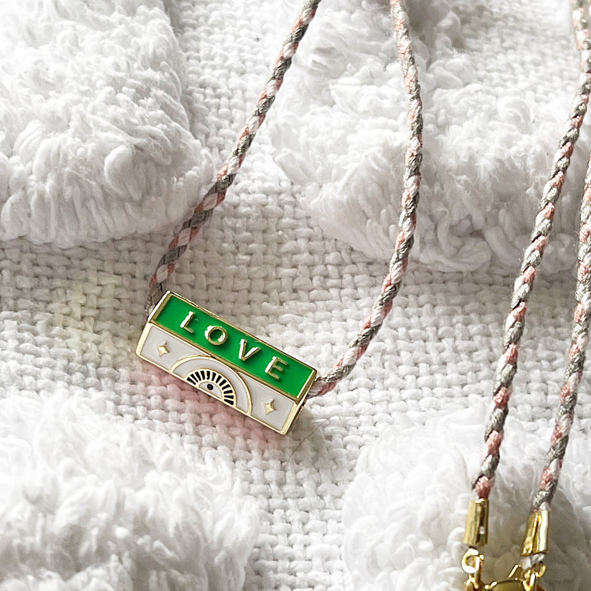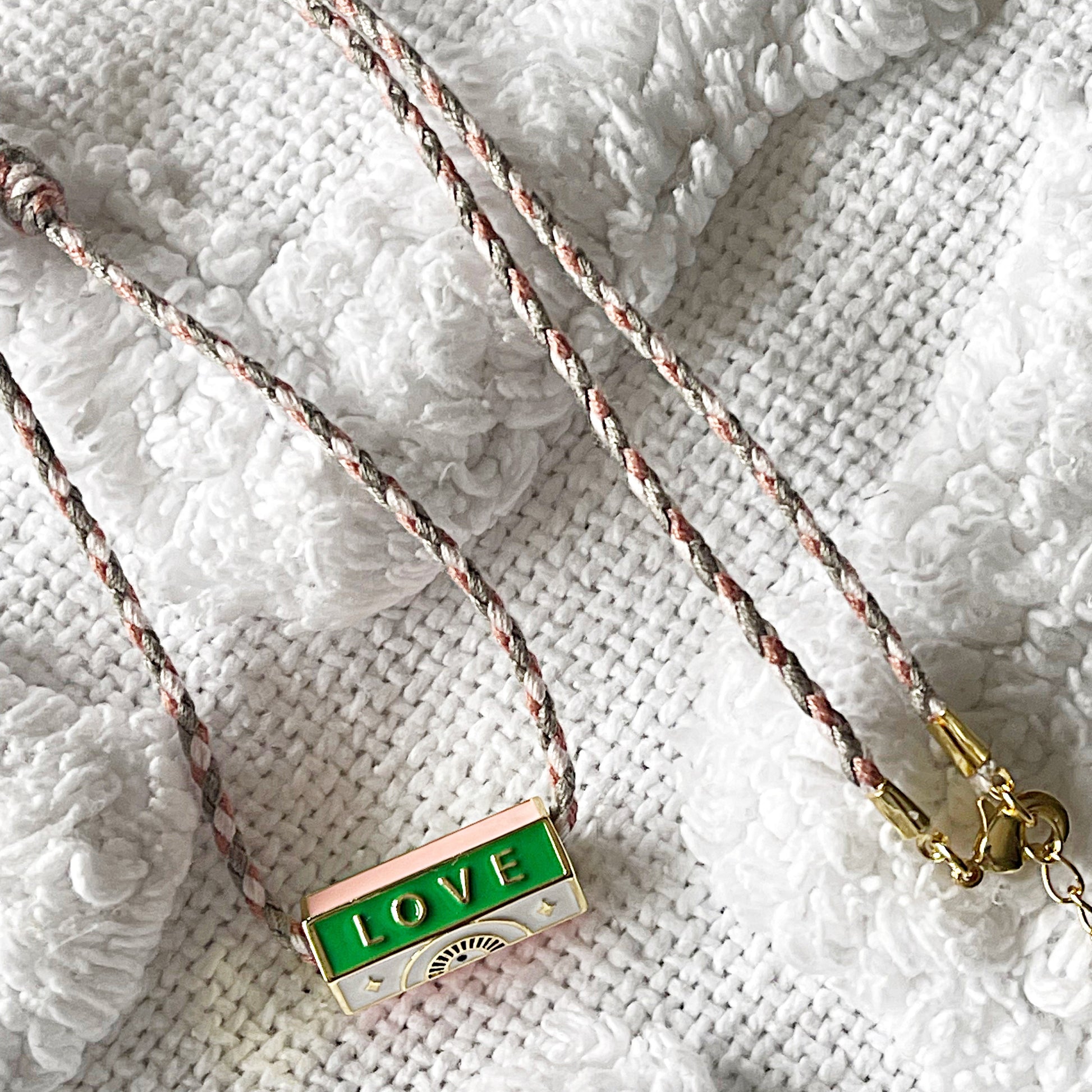 Handcrafted bohemian charm necklace. Multi pink & green coloured enamel charm with gold detailing and a braided cotton multi coloured adjustable neck tie.